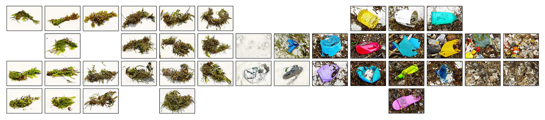 WPB 637, 2023, 8-pieces, Pigmentprints on Cottonpaper, 88 x 250 cmMSW 325, 2023, 18-pcs., Pigmentprint on Cottonpaper, 132 x 272 cmQJK 914, 2022, 4-pieces, 60 x 180 cm, Pigmentprints on CottonpaperMSP 757, 2021, 3-pices, 42 x 191 cm, Pigmentprints on CottonpaperMQS 203, 2021, 5-pieces, 88 x 188 cm, Pigmentprints on Cottonpaper GNK 236, 2020, 2-pieces, 42 x 123 cm, Pigmentprints on CottonpaperPlasticforever, 2019, 40-pieces, 132 x 640 cm, Pigmentprints on Cottonpaper WBK 146, 2019, 9-pieces, 42 x 566 cm, Pigmentprints on CottonpaperLHM BW, 2019, 15-pieces, 226 x 188 cm, Pigmentprints on CottonpaperSRL 203, 2004, 126-pieces, 180 x 770 cm, Silver-gelatin-paper, Acryl, Sand on KapaplastSRT 128, 1998, 42-pieces, 125 x 405 cm, Silver-gelatin-paper, Acryl, Sand on KapaplastMetamorphosis 23, 1994, 31-pieces, 96 x 303 cm, Silver-gelatin-paper, Acryl, Sand on KapaplastJFP 992, 1993, 324-pieces, 450 x 650 cm, Pigmentprints on Cottonpaperenzoklopädisches, 1992, many pieces, each 21 x 29,7 cm, Silver-gelatin-paper, Acryl, Sand on Kapaplast